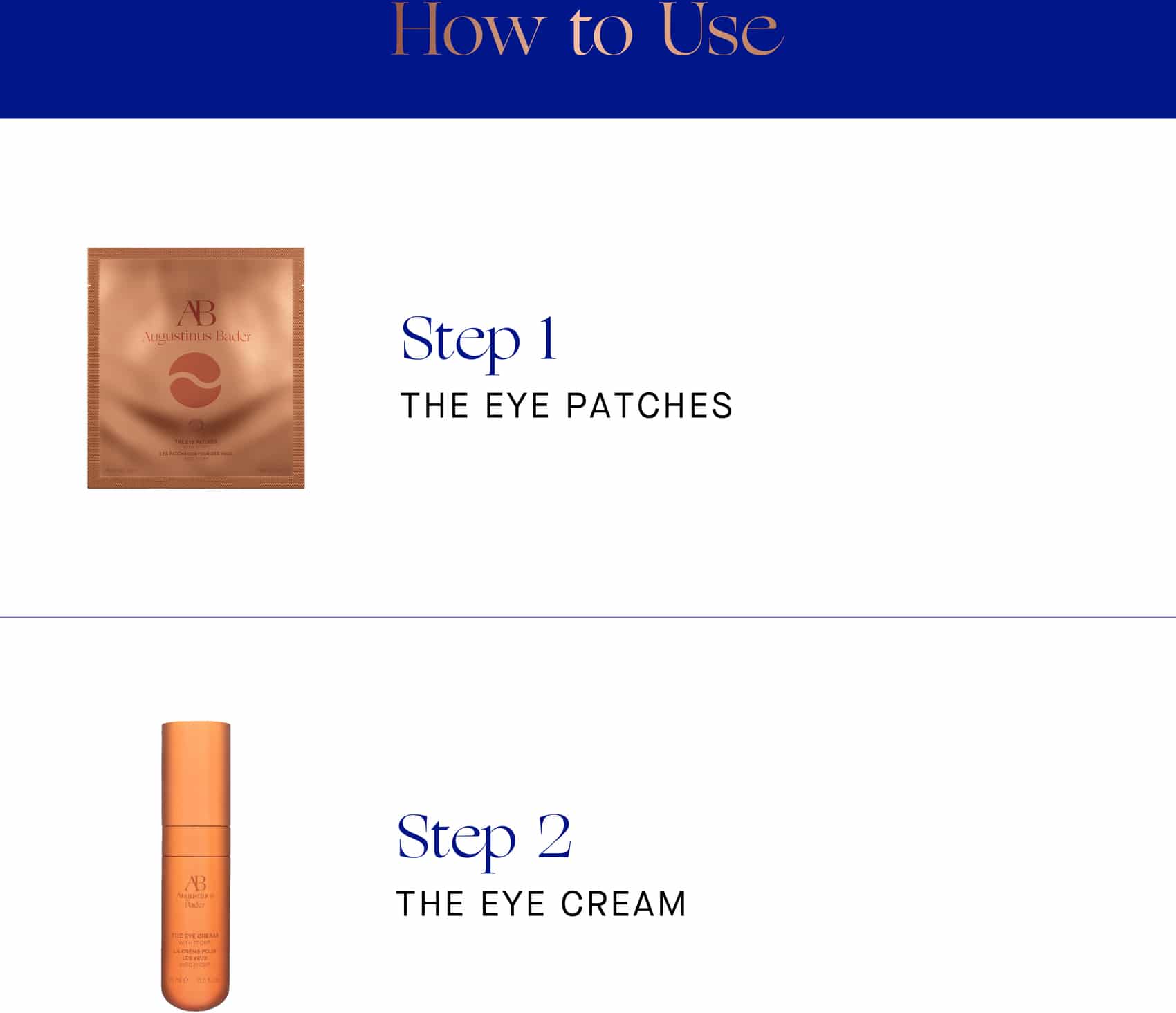 "The Eye Patches Aqua/Water/Eau, Glycerin, 1,2-Hexanediol, Chondrus Crispus Powder, Ceratonia Siliqua Gum, Xanthan Gum, Allantoin, Synthetic Fluorphlogopite, Niacinamide, Panthenol, CI 77491 (Iron Oxide), Agar, Cyamopsis Tetragonoloba (Guar) Gum, CI 77891 (Titanium Dioxide), Ethylhexylglycerin, Adenosine, Calcium Lactate, Glucose, Potassium Chloride, Pentylene Glycol, Sodium Phytate, Chlorphenesin, Rhizobian Gum, Sodium Acetylated Hyaluronate, Tin Oxide, Tocopheryl Acetate, Caprylic/Capric Triglyceride, Hydrogenated Phosphatidylcholine, Hydrolyzed Rice Protein, Maltodextrin, Citric Acid, Alanyl Glutamine, Arginine, Butyrospermum Parkii (Shea) Butter, Camellia Sinensis Leaf Extract, Squalane, Brassica Alba Seed Extract, Ceramide NP, Hydrogenated Lecithin, Oligopeptide-177, Phenylalanine, Potassium Sorbate, Sodium Chloride. The Eye Cream Aqua/Water/Eau, Glycerin, Coco-Caprylate/Caprate, Panthenol, Ethyl Oleate, Ethylhexyl Polyhydroxystearate, Squalane, Glyceryl Stearate Citrate, Hydrogenated Vegetable Glycerides, Niacinamide, Ascorbyl Tetraisopalmitate, Sodium Stearoyl Glutamate, Polyglyceryl-3 Stearate, Oleic Acid, Cocos Nucifera (Coconut) Oil, Silica, Simmondsia Chinensis (Jojoba) Seed Oil, Hydrogenated Lecithin, Undaria Pinnatifida Extract, Xanthan Gum, Potassium Sorbate, Citric Acid, Sodium Benzoate, Terminalia Arjuna Extract, Centella Asiatica Flower/Leaf/Stem Extract, Hydrolyzed Rice Protein, Maltodextrin, Sodium Phytate, Lecithin, Corallina Officinalis Extract, Camellia Sinensis Leaf Extract, Tocopheryl Acetate, Tocopherol, Alanyl Glutamine, Arginine, Oligopeptide-177, Sodium Chloride, Phenylalanine, Sisymbrium Irio Seed Oil. "