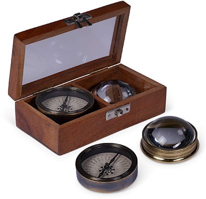 Gift Box Instruments #1 Victorian engineers loved to thinker with design, and make things look interesting and especially larger than life. We combined various items as a richly nostalgic, and gracious set. This set contain: Polaris Compass and a Fish Eye Magnifier.