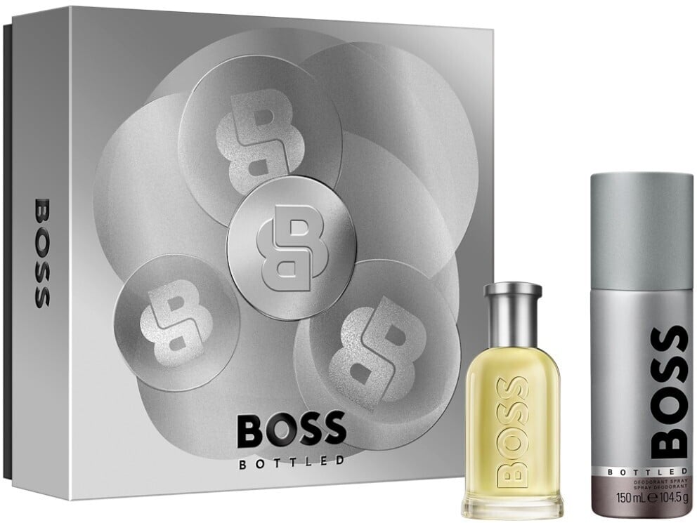 Grab the magic—own the moment this holiday season with the BOSS Bottled Eau de Toilette gift set for him. Radiate confidence with BOSS Bottled Eau de Toilette. This fresh and masculine perfume exudes distinction with a fruity top note, a spicy heart and a confident, woody base. This BOSS Bottled Eau de Toilette holiday gift set contains: • BOSS Bottled Eau de Toilette for Men, 50ml (1.6oz) • BOSS Bottled Deodorant Spray for Men, 150ml (5oz)