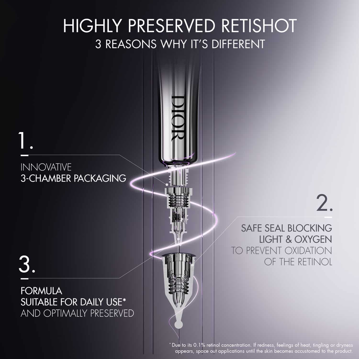 "Capture Totale Retishot night concentrate is Dior's first intensive solution that corrects the appearance of 6 age-related skin quality issues: visible pores, a dull complexion, roughness, unevenness, imperfections and marks such as those caused by the sun or acne.