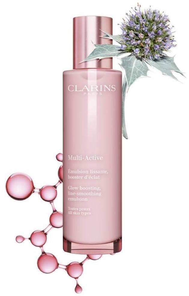 The Clarins Multi-Active Day Emulsion maintains energy and glow in the skin without leaving a shiny appearance due to its light consistency.