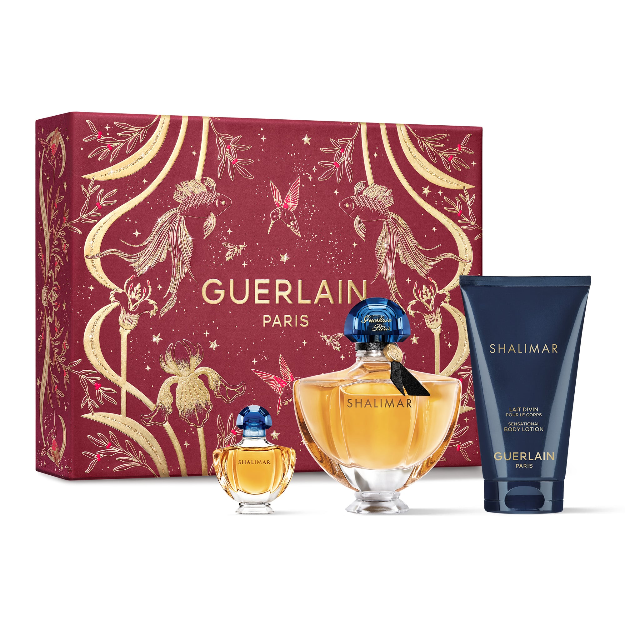 This set contains: Shalimar de Guerlain Paris Eau de Parfum (50 mL and a travel size 5 mL), a voluptuous, sensual, spellbinding amber scent. A flight of flowers and bergamot whips up the top with a breeze of freshness, warmed by notes of iris, jasmine and rose at the heart. For the base, imprints of vanilla, the roundness of balsam and the gourmand warmth of tonka bean combine to create a sensual symphony. Shalimar Sensational Body Lotion (75 mL), a fluid, velvety texture that leaves a shiver of delight on the skin delicately perfumed