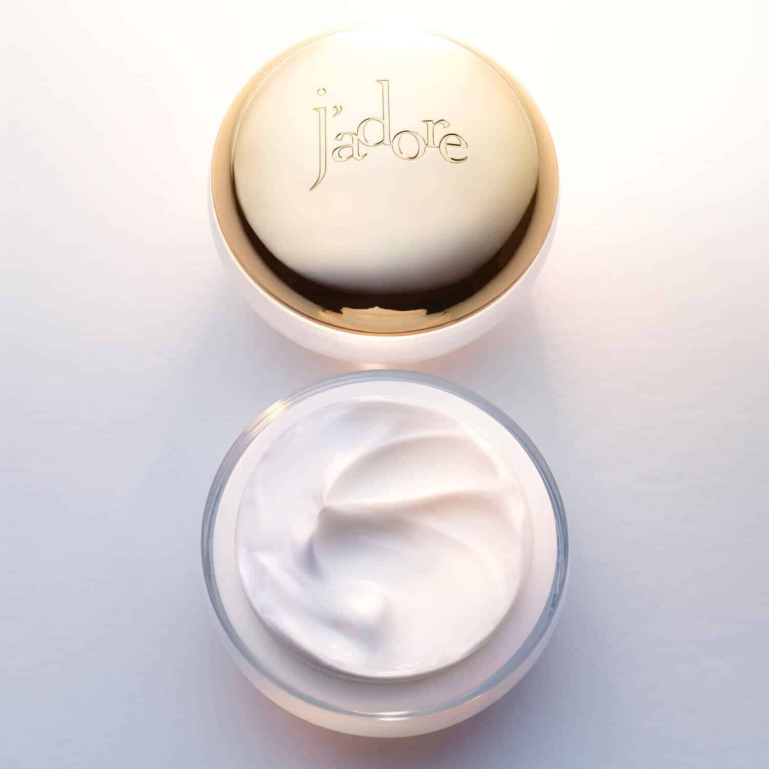 Formulated with 92%* natural-origin ingredients, this scented body cream hydrates and envelops the skin. Its opalescent white hue is showcased in a glass jar that evokes the J'adore bead.