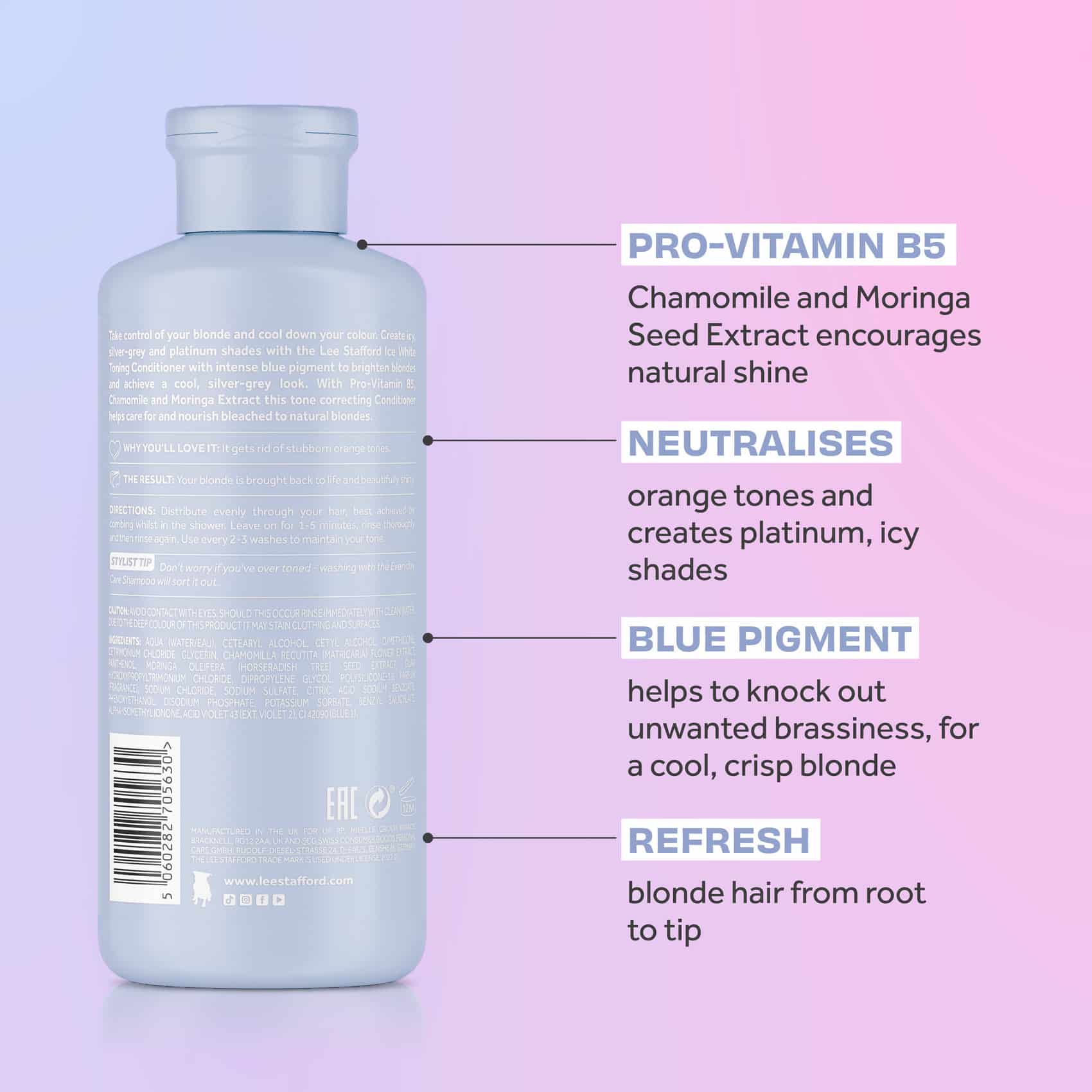 Banish those brassy orange tones and maintain your salon-fresh blonde for longer! Refresh your blonde with the nourishing Lee Stafford Bleach Blondes Ice White Toning Conditioner. This blue conditioner is a crucial colour corrector for blonde hair, created to cool down your colour and neutralise orange tones and brassiness for an icy, silver-grey look.