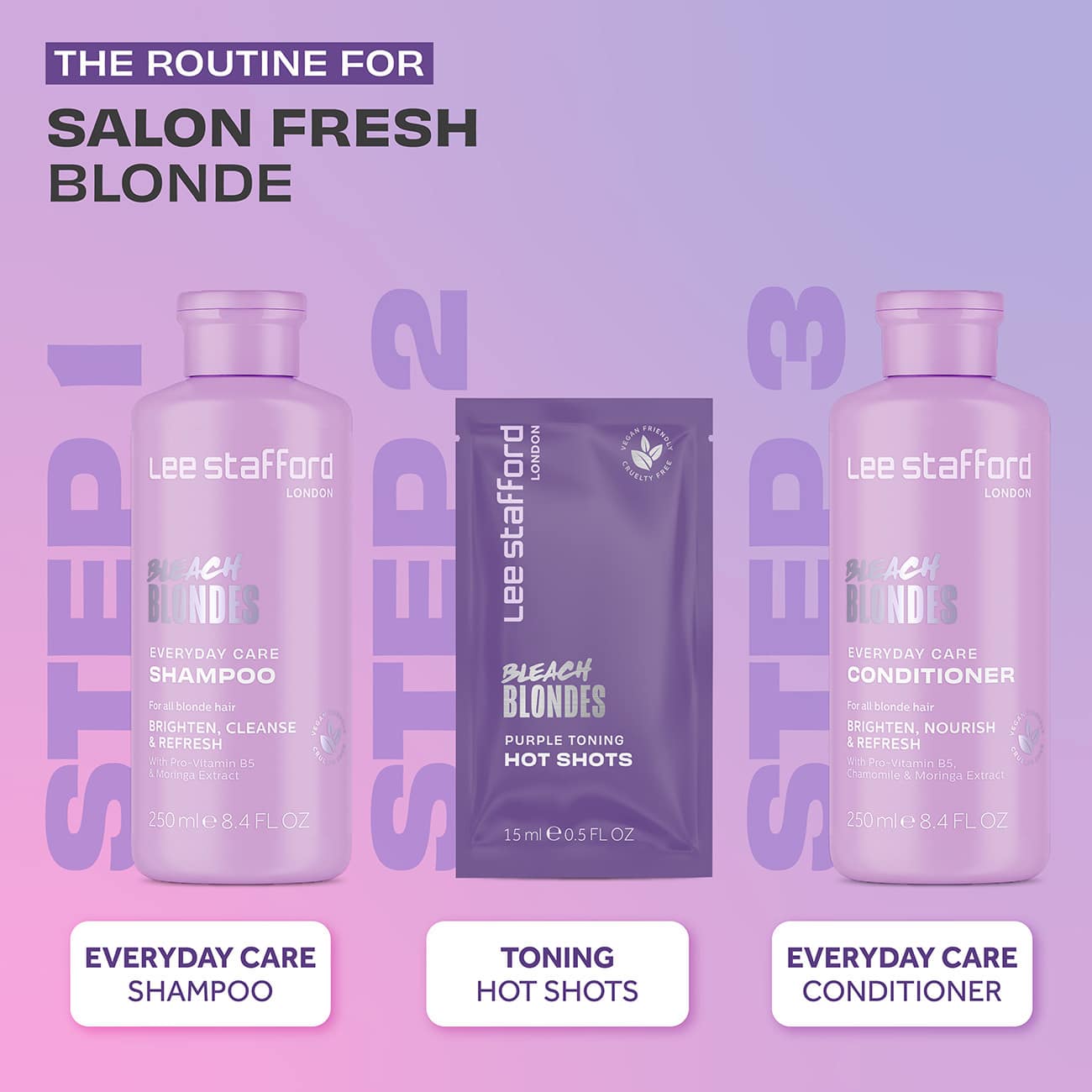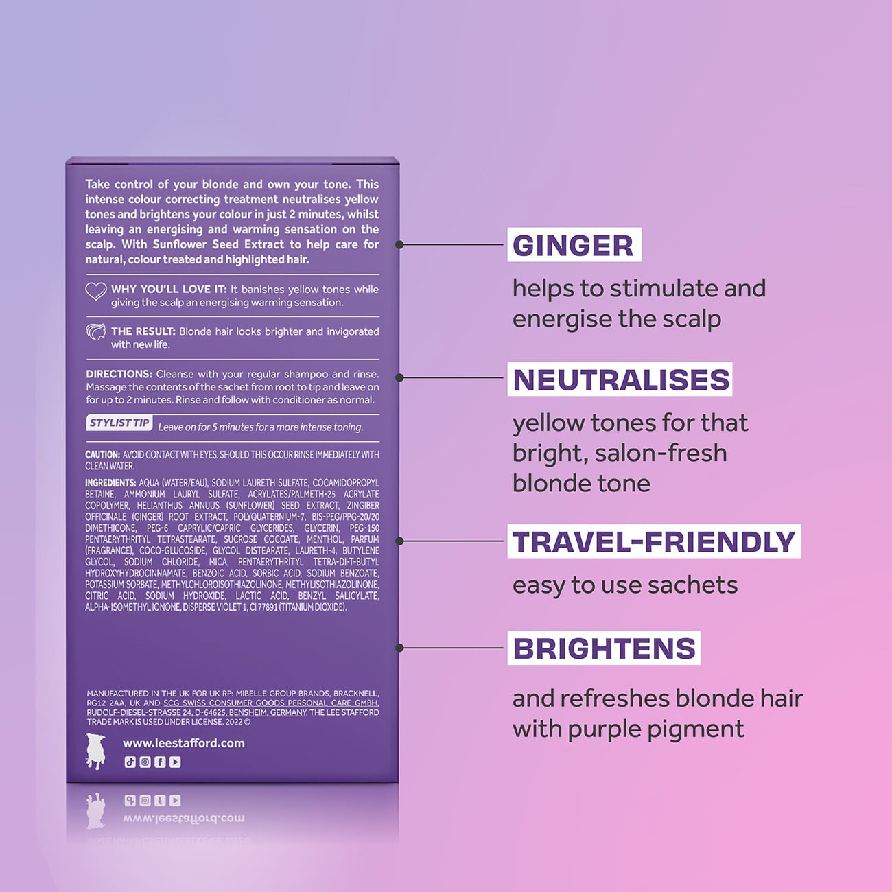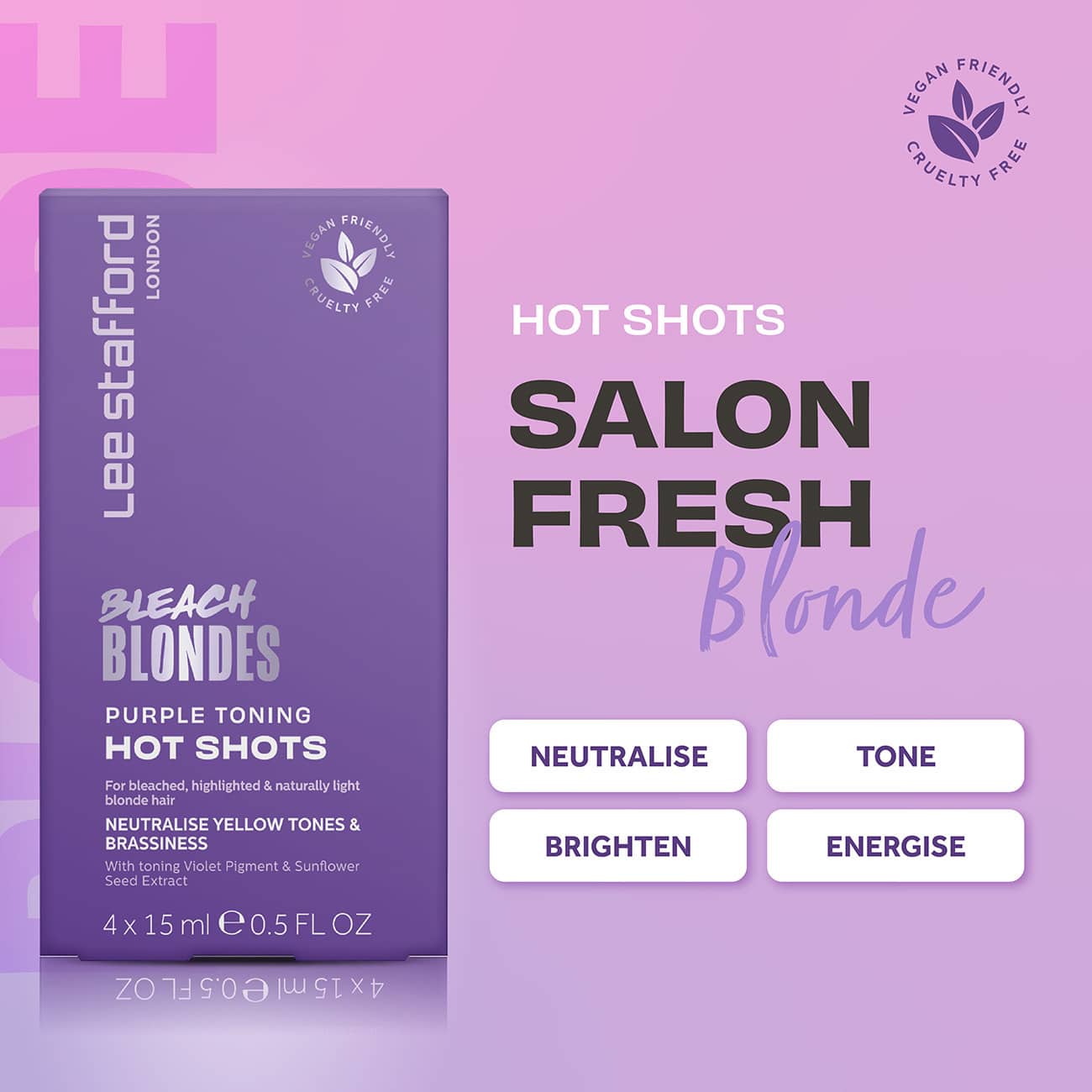 A toning shot for blondes on the go! The Lee Stafford Bleach Blondes Purple Toning Hot Shots is a pack of four colour correctors with violet pigment to banish yellow tones and brassiness in a shot.