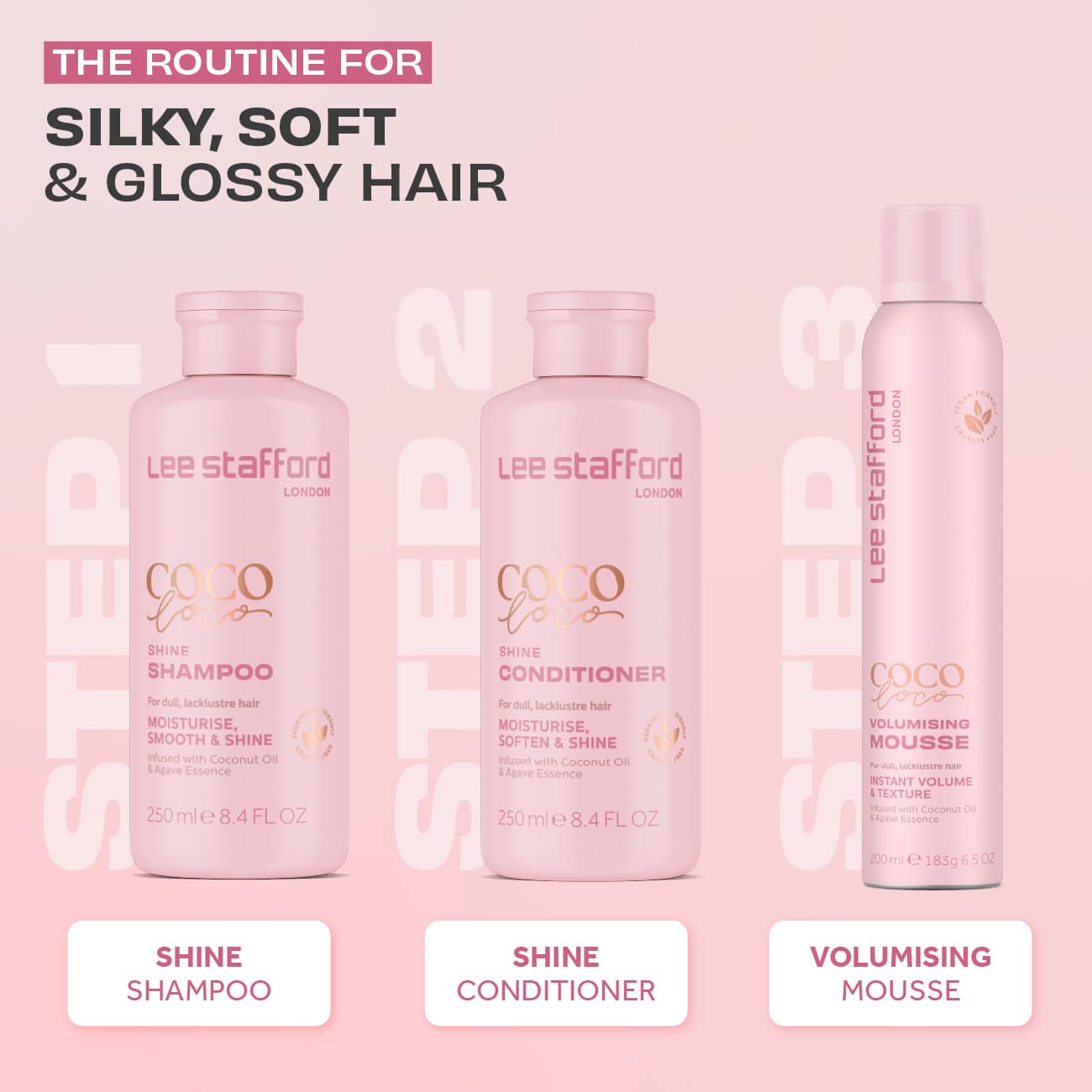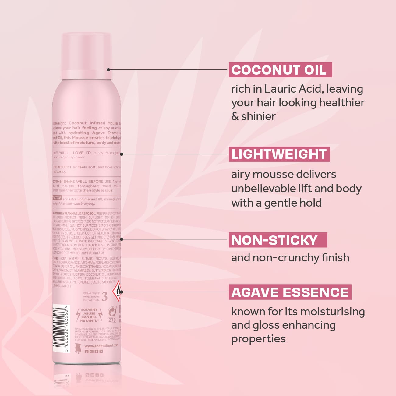 Infused with Coconut Oil and Agave Essence, The Lee Stafford Coco Loco Coconut Mousse has a lightweight airy consistency, giving hair unbelievable lift, body and volume with a gentle hold. With a non-sticky and non-crunchy finish, our unique coconutty mousse will leave your hair feeling touchably soft and naturally cushioned. Massage into roots for maximum lift, so your hair looks and feels great from root to tip. Our sweet Coconut and Agave scent is long lasting, so with every hair swish the fragrance will transport you to a tropical destination.