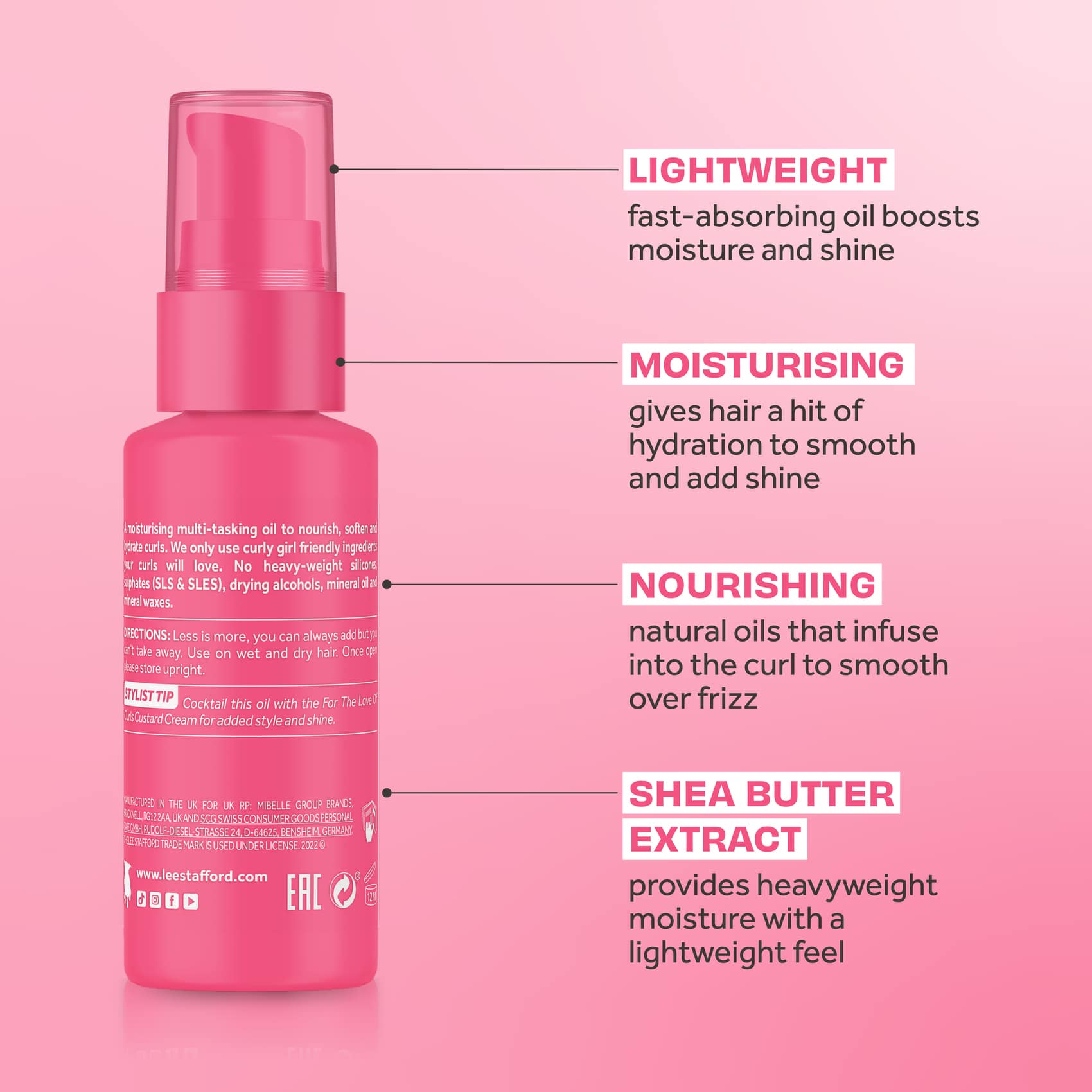 Give frizzy, parched curls a much needed hit of hydration with Lee Stafford For The Love Of Curls Frizz Taming Oil For Waves, Curls & Coils. A fast-absorbing hair oil that gets to work quick on boosting moisture in every strand, protecting delicate curls and delivering enviable gloss. Sweeping through mid-lengths to ends will smooth, de-frizz, and detangle. In fact, 81% of curly girls agreed that this super oil tamed frizz, smoothed hair and left a super shiny finish*.
