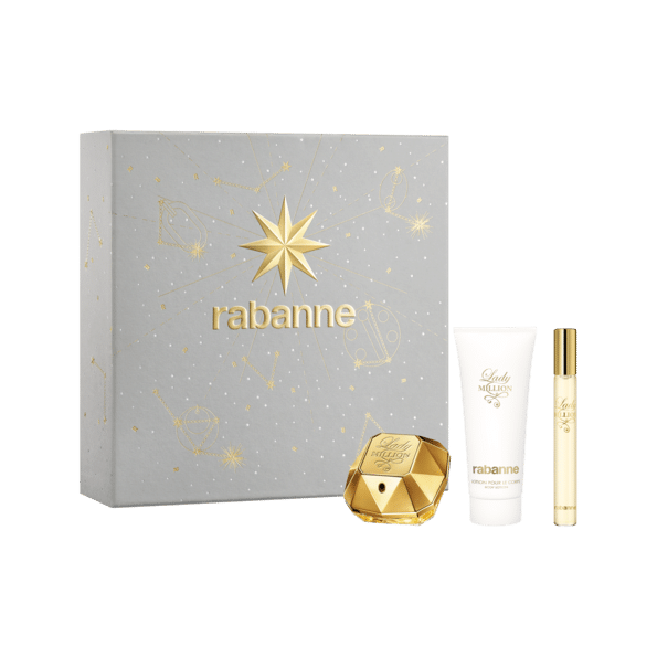 Rabanne, the gift of enchanting savoir-faire. Discover the iconic Lady Million with this seductive Eau de Toilette (50ml), Body Lotion (75ml) and Travel Spray (10ml) for a dazzling holiday season.