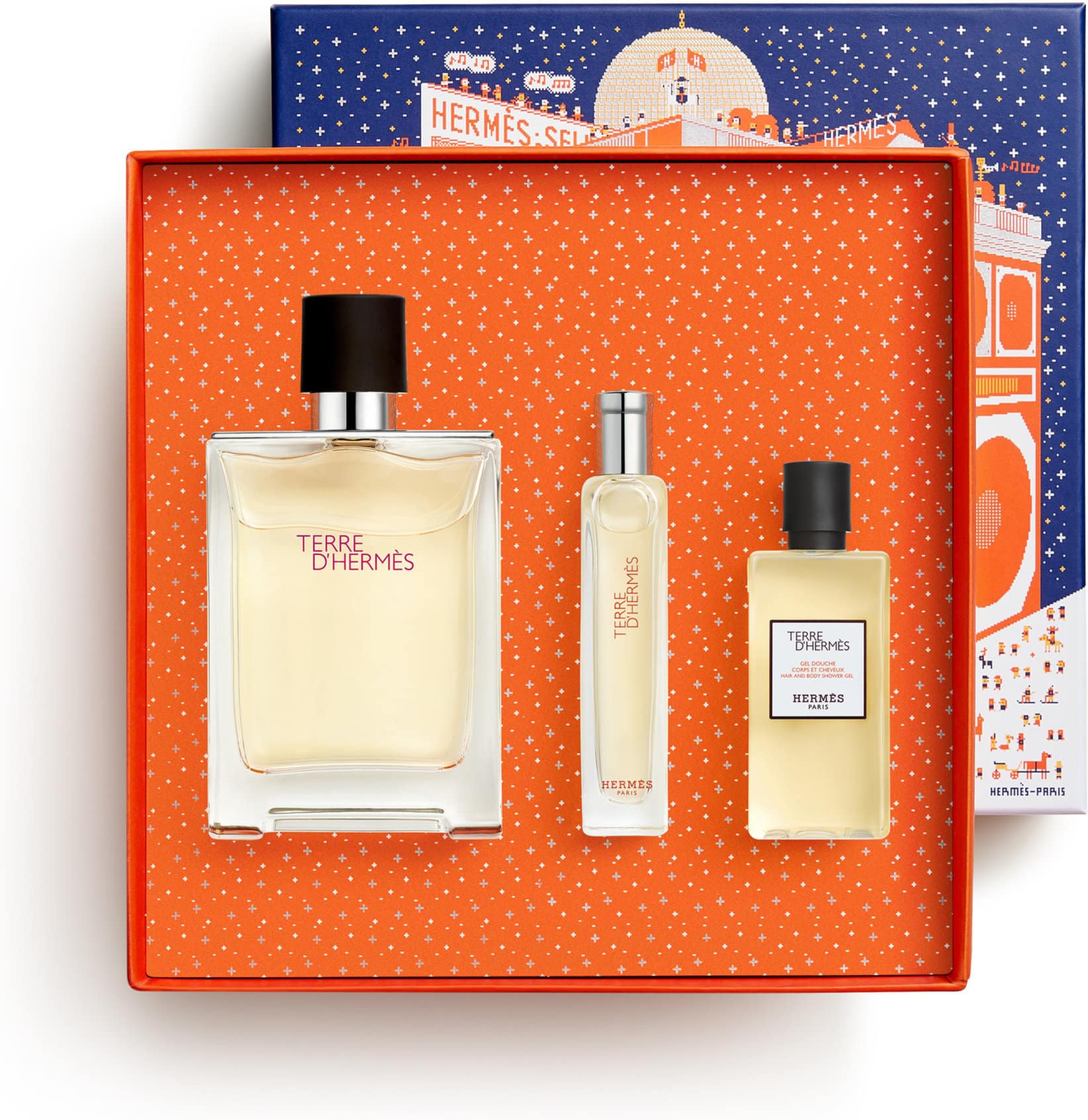 This gift set comprises one 100 ml Terre d’Hermès Eau de Toilette, one 15 ml travel size Terre d’Hermès Eau de Toilette, and one 40 ml hair and body shower gel.