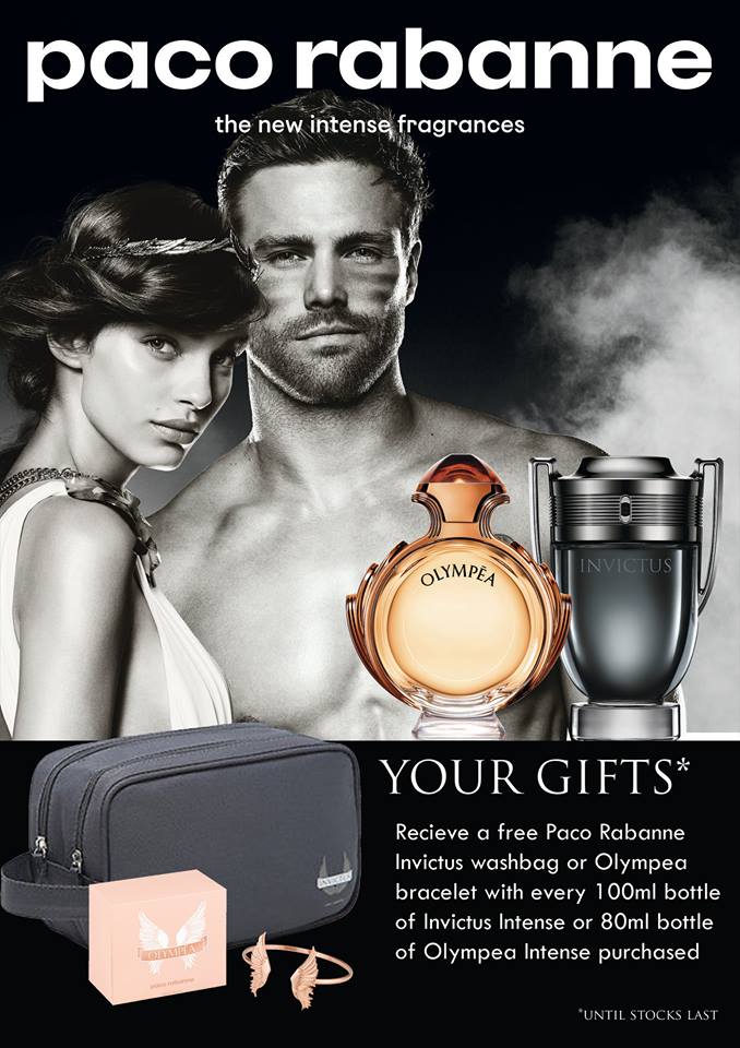 Paco Rabanne Olympéa Intense and Invictus Intense – The Heroic God and Goddess of fragrance return in a mythical storm of renewed intensity. Paco Rabanne’s Invictus and Olympea Intense deliver divine power, carnal sensuality and legendary triumph with every spray. Olympéa Intense dares the duality of a transparent floral freshness and the sensuality of a salty-vanilla accord, wrapped up in cashmere wood.